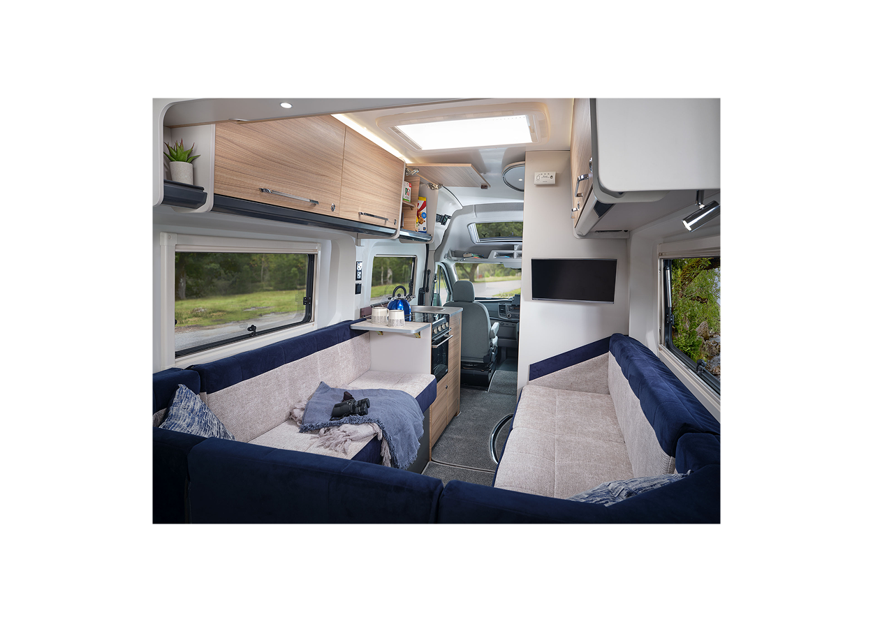 At the rear of the Bailey Endeavour B62 is a flexible lounge space. Here you can choose to enjoy a spacious U-shaped sofa to kick back on at the end of a long day, or two parallel sofas - removing the middle seat to create an access point to the lounge from the back of the van. When it’s time to get some much needed rest at the end of the day, you can choose to set the sofa up as two single beds, each of which are 6’3 long, or one large double bed.