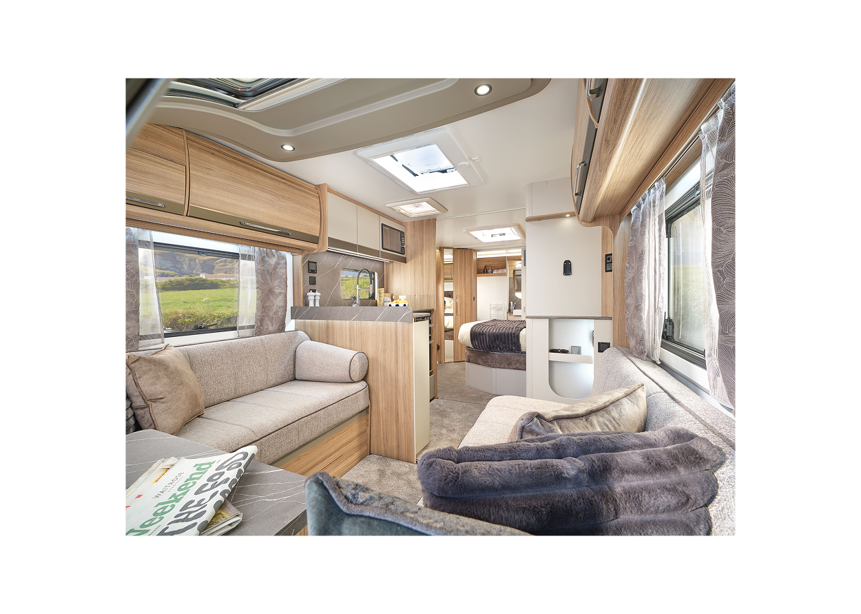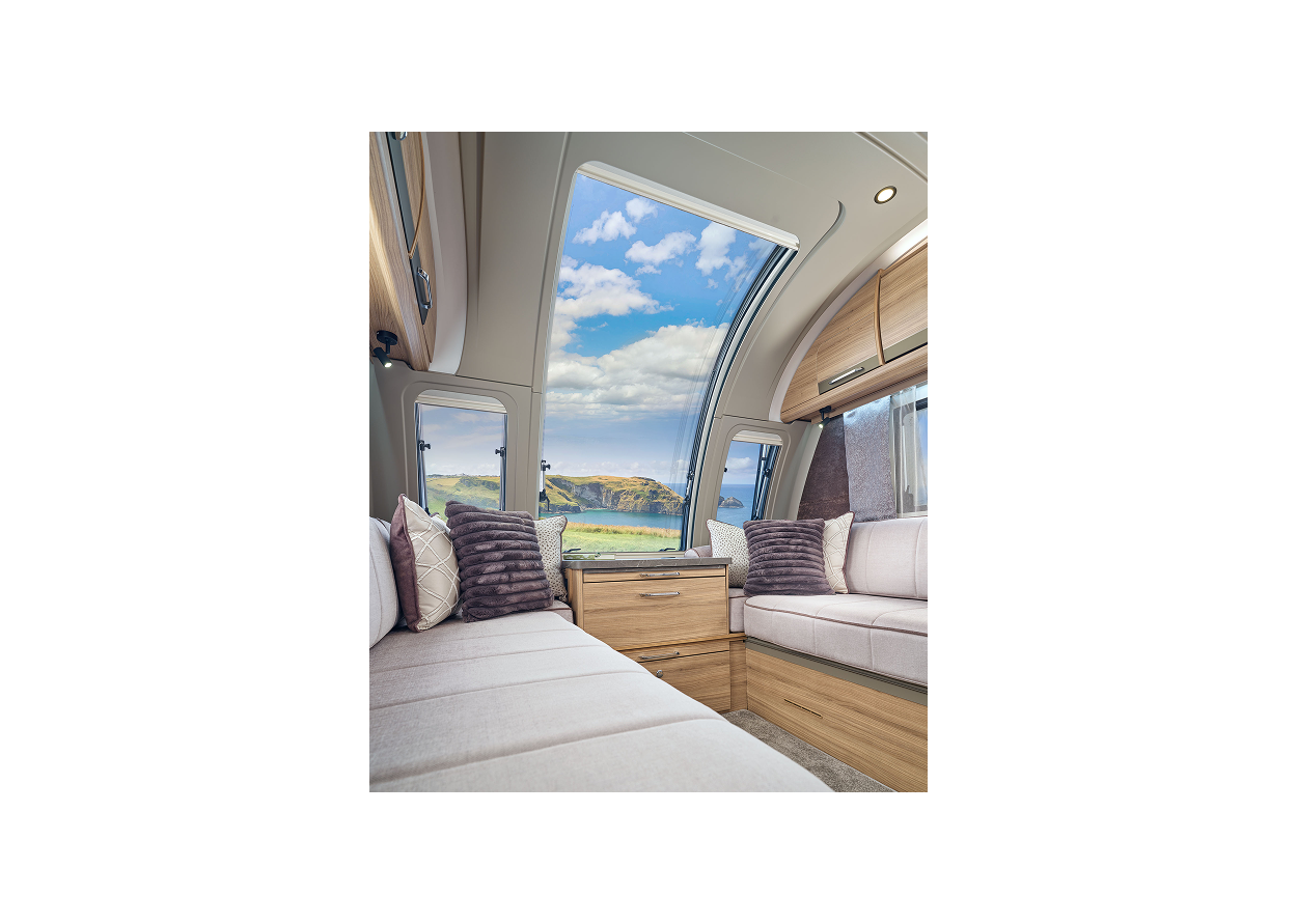 The Alicanto Grande Deluxe Sintra boasts a welcoming front lounge with a vertical front infinity window, creating a bright and airy atmosphere. The rear bedroom features a transverse island bed with a 'Poise' King size pocket sprung mattress, ensuring restful nights after long, adventurous days.