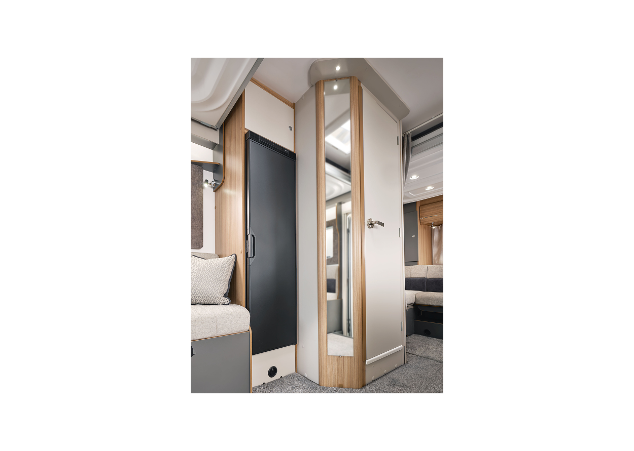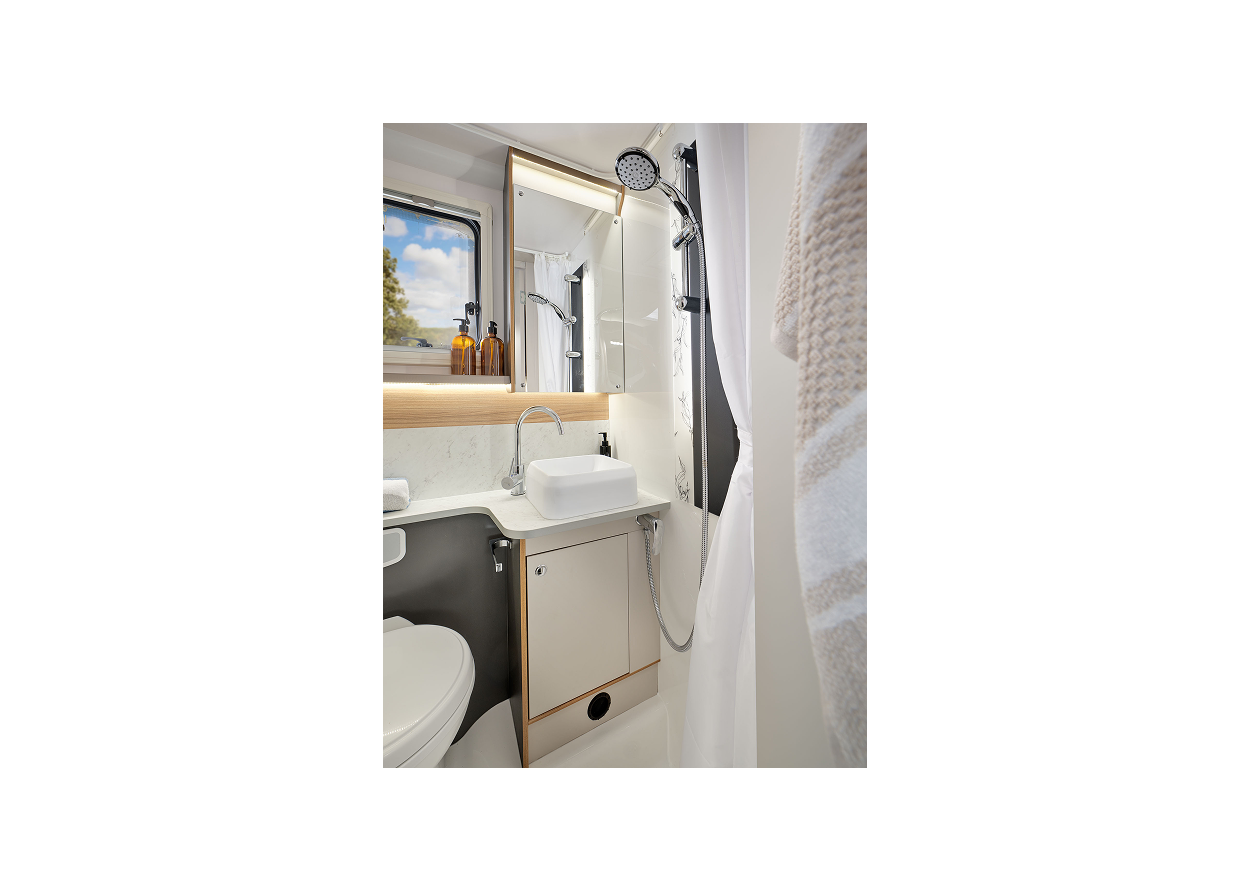 The clever and compact bathroom is located opposite the kitchen and features a shower unit with a ceramic ball mixer tap and an Ecocamel shower head. There's a convenient hanging space for your towels. The luxurious hand basin features a stylish swan neck tap and a Thetford electric flush toilet. Storage isn’t an issue here either, with secure storage below the hand basin and a mirrored unit above the sink with an integrated toothbrush holder.