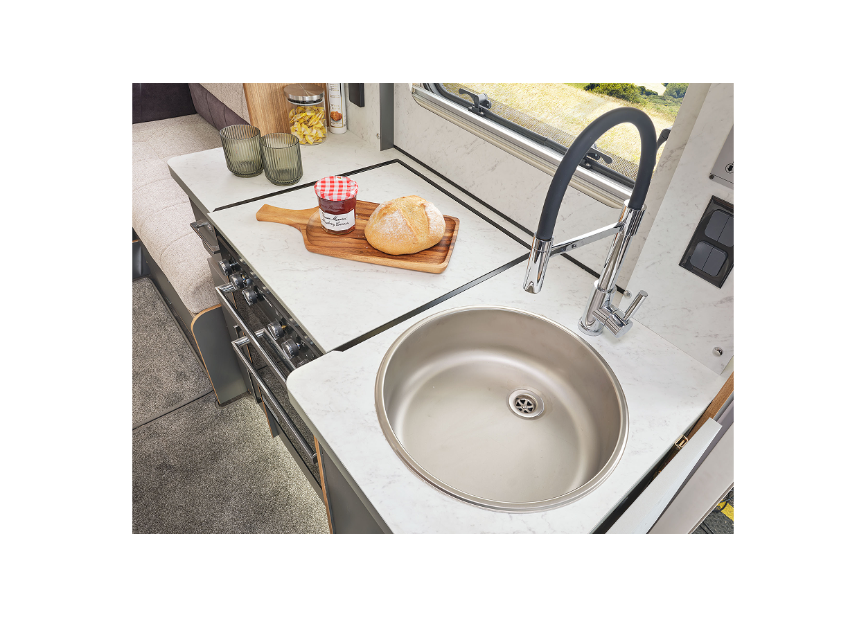 There is a well equipped kitchen on board with all the appliances you’ll need to whip up some family favorite's while on the road. The Thetford ‘K-Series’ combined oven, grill, three burner hob and hot plate are big enough to cook a Sunday roast. There’s an extendable worktop to ensure you never run out of room when preparing your meals, as well as a large circular sink to clean up in afterwards. You’ll find plenty of storage in the kitchen in domestic style kitchen units, and a very generous Thetford 141 litre combined tower refrigerator with freezer compartment.