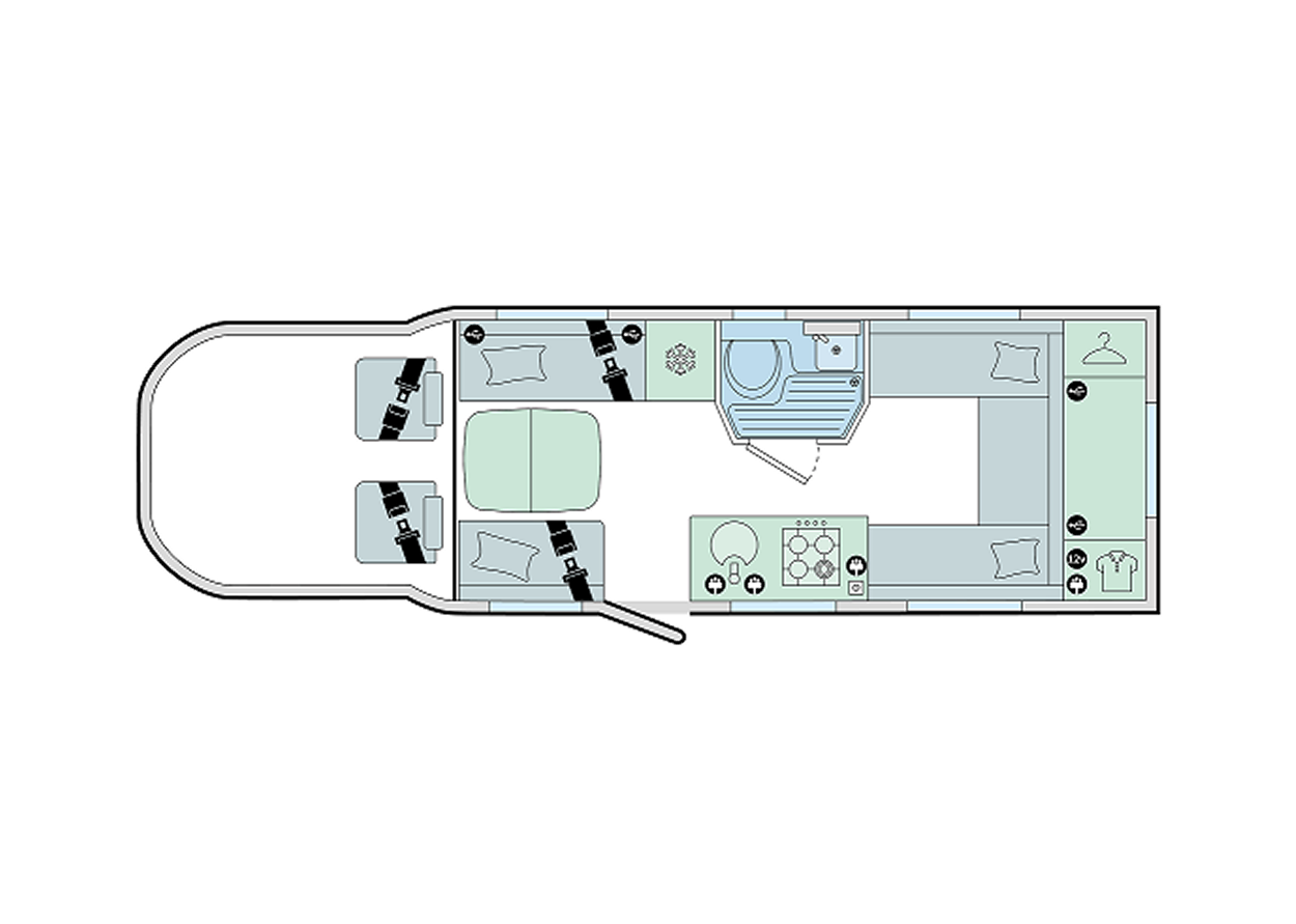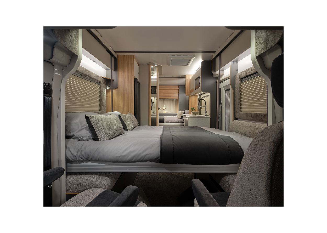 The Bailey Adamo 75-4DL features a sociable double lounge layout, making it the perfect Adamo model for families and groups of friends. The rear lounge features domestic style sofa seating, with plenty of storage beneath the seats. There is an optional bed pack to turn this lounge area into your third double bed. The flexi-lounge at the front features an electric pedestal table making it the perfect spot to enjoy a meal together or plan the day’s adventures. The travel seats are stored here, quickly and easily converting to two additional belted seats, as well as the swivel front cab seats. Again, you can opt for the bed pack to turn this area into a fourth double bed, creating sleeping space for up to 8 people. In the evening, easily convert both spaces into cosy double bedrooms with the electric-operated drop-down beds with just the touch of a button.