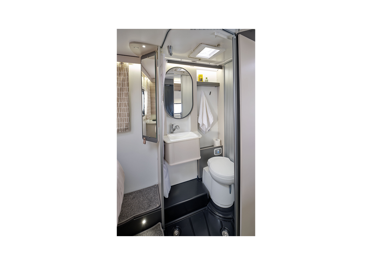 The Alora 69-4I boasts a clever, compact bathroom providing everything you need to stay fresh on the road in limited space. Behind the space-saving sliding tambour door you’ll find a Thetford 12v electric flush toilet, sink and vanity mirror with enclosed storage for your bathroom essentials. But , slide this sink to the side and you’ll reveal the shower - simply remove the floor infill to reveal the shower floor and drainage. There are shelves here to keep your shower essentials as well as two hooks for hanging towels and a drying rail which folds down from the ceiling.