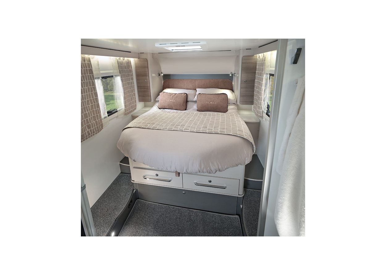 At the front on the Bailey Alora 69-4I you’ll find comfortable twin parallel sofas, with the travel seats stowed away beneath. There’s plenty of storage in the overhead lockers, and handy spotlights not only provide some light in the evening but also feature USB points to charge your devices. The two sofas easily convert into a comfortable single bed for any guests joining you on your latest adventure. Moving through the Alora 69-4I to the rear bedroom you’ll find the luxurious rear island bed. Here you’ll find warm spotlights providing the perfect reading lights, these also feature USB points for handy bedside charging. There are bedside tables on either side, as well as spacious floating wardrobes. The storage doesn’t end there, with shelving, under bed drawers and the bed lifts up to reveal even more storage for larger items. There’s a fold out mirror to fix your hair for the day ahead.
