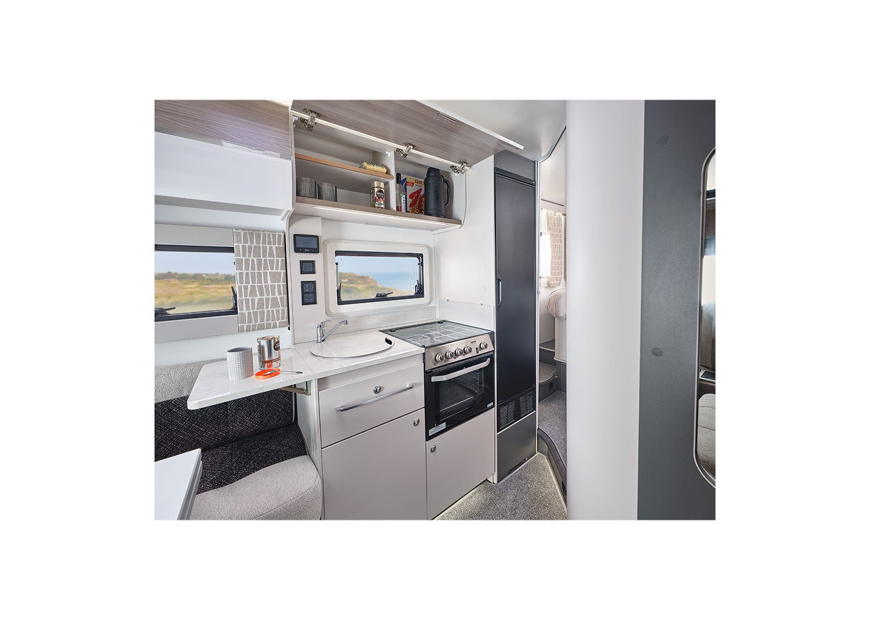 The kitchen is in the centre of the Bailey Alora 69-4I, ideally located next to the living/dining space. The worktops are finished in a beautiful white quartz to add a luxury feel here, and there’s an extendable worktop space to ensure you never run out of space. The kitchen is fully-equipped featuring a Thetford dual fuel hob, with three ring gas burner and electric hotplate and combi oven and grill. There’s an impressive Thetford 138 litre compressor refrigerator with a 12 litre freezer compartment. You’ll find lots of storage here too, with a dedicated cutlery drawer and under sink cabinets as well as the large overhead lockers.